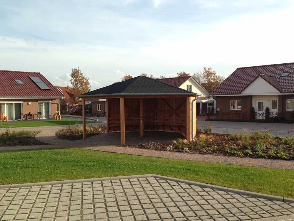 Gemäß des vorhandenen B-Planes der Gemeinde Vögelsen ist nach unserer Planung eine Wohnanlage „Generation 50 plus – Gemeinschaftliches Wohnen in Vögelsen“ mit zehn Doppelhäusern und einem Einzelhaus realisiert worden. Die Doppelhäuser wurden in ebenerdigem Bungalowstil errichtet. Im Zentrum der Wohnanlage entstand eine parkähnliche Grünfläche mit einem Gartenpavillon, welche genügend Raum zur Kommunikation zwischen den Bewohnern bietet.